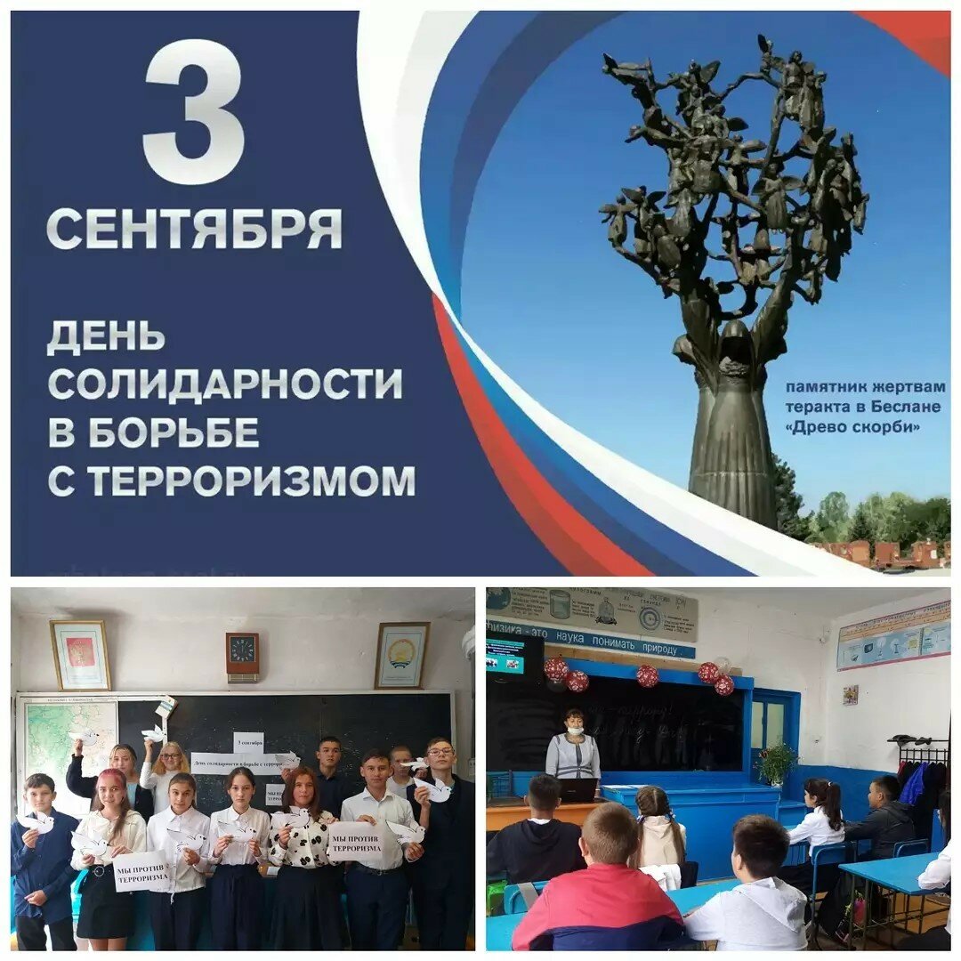 Ежегодно 3 сентября в России отмечается День солидарности в борьбе с терроризмом. Он был установлен федеральным законом "О внесении изменений в Федеральный закон "О днях воинской славы (победных днях) России" от 21 июля 2005 года. Этот день приурочен к трагическим событиям, произошедшим 1-3 сентября 2004 года в городе Беслан (Северная Осетия), когда в результате беспрецедентного по своей жестокости террористического акта погибли более 300 человек, в основном женщины и дети. 3 сентября Россия отдает дань памяти тысячам соотечественников, погибшим от рук террористов в Беслане, в театральном центре на Дубровке, в Буденновске, Первомайском, при взрывах жилых домов в Москве, Буйнакске и Волгодонске, в других террористических актах. Классные часы, посвященные Дню солидарности в борьбе с терроризмом, прошли 3 сентября в нашей школе. Это классные часы по темам «3 сентября – День солидарности в борьбе с терроризмом», «Терроризм – угроза обществу» и «Вместе против террора». В ходе классных часов ребята посмотрели кадры хроники о действиях террористов, а после почтили минутой молчания жертв террора. Затем состоялось обсуждение основных правил поведения в условиях угрозы террористических актов. Целью мероприятий стало объяснение детям сущности терроризма, совершенствование у них знаний о терроризме, об основах безопасности в чрезвычайных ситуациях формирование общественного сознания и гражданской позиции у подрастающего поколения.