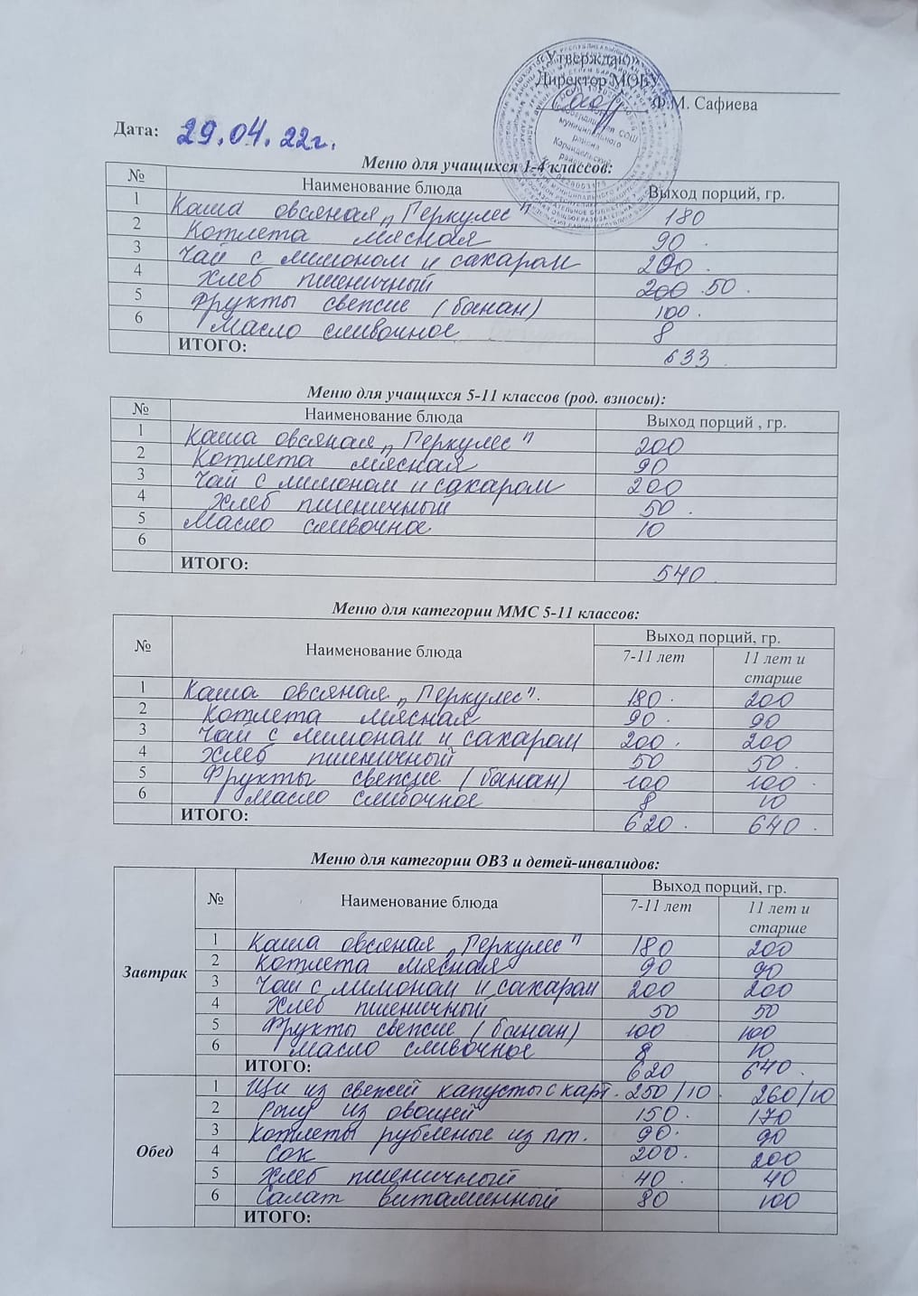 (Меню на 29 апреля)