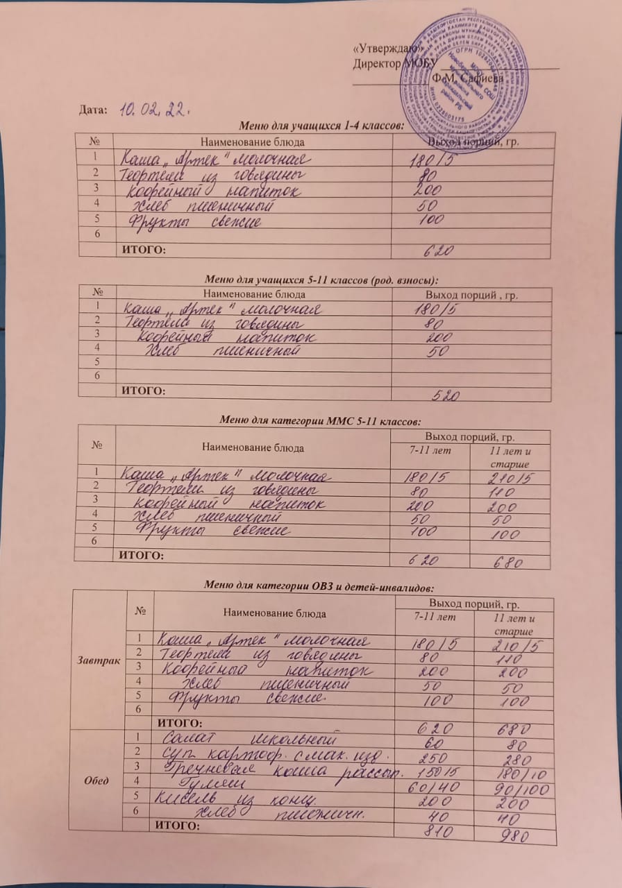 (Меню на 10 февраля)