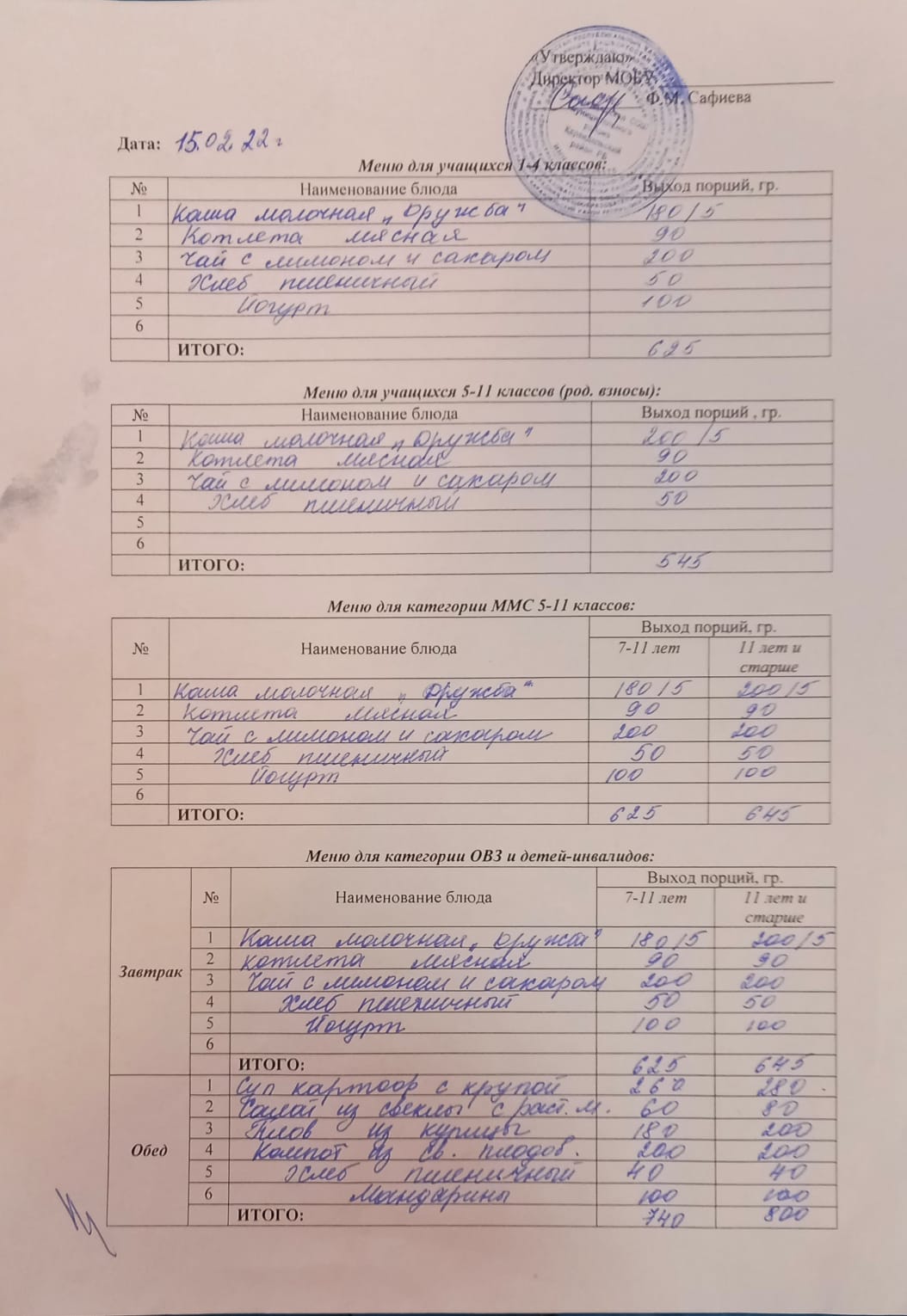 (Меню на 15 февраля)
